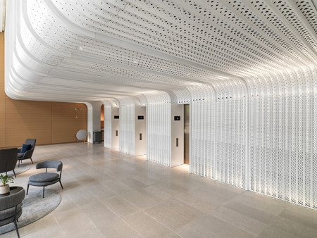 The veil-like design was inspired by the site’s legacy, the entry-ways incorporate pearlescent white aluminium with lace-like graduated diamond perforations and striking linear architectural bronze.