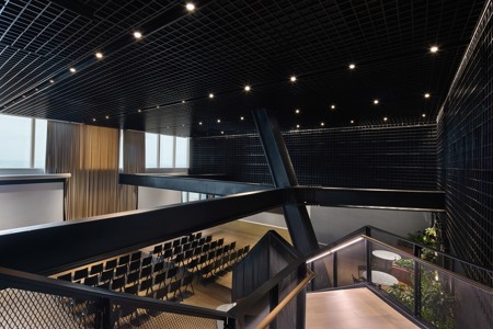 With a Jet Black RAL finish, this system complements the building’s exposed steel supports to deliver a bold, cinema-style interior.
